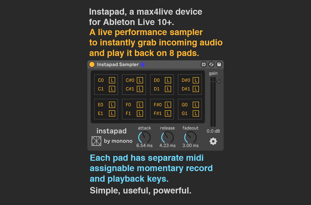 A max for live device for Ableton Live that allows users to instantly capture samples on the fly and play them back in a musical way. Great for beatbox artists, vocal chopping, foley rhythms, real time remixing/mashups, buffer effects, and more. A pad based midi controller like a launchpad or push is recommended, but not required.